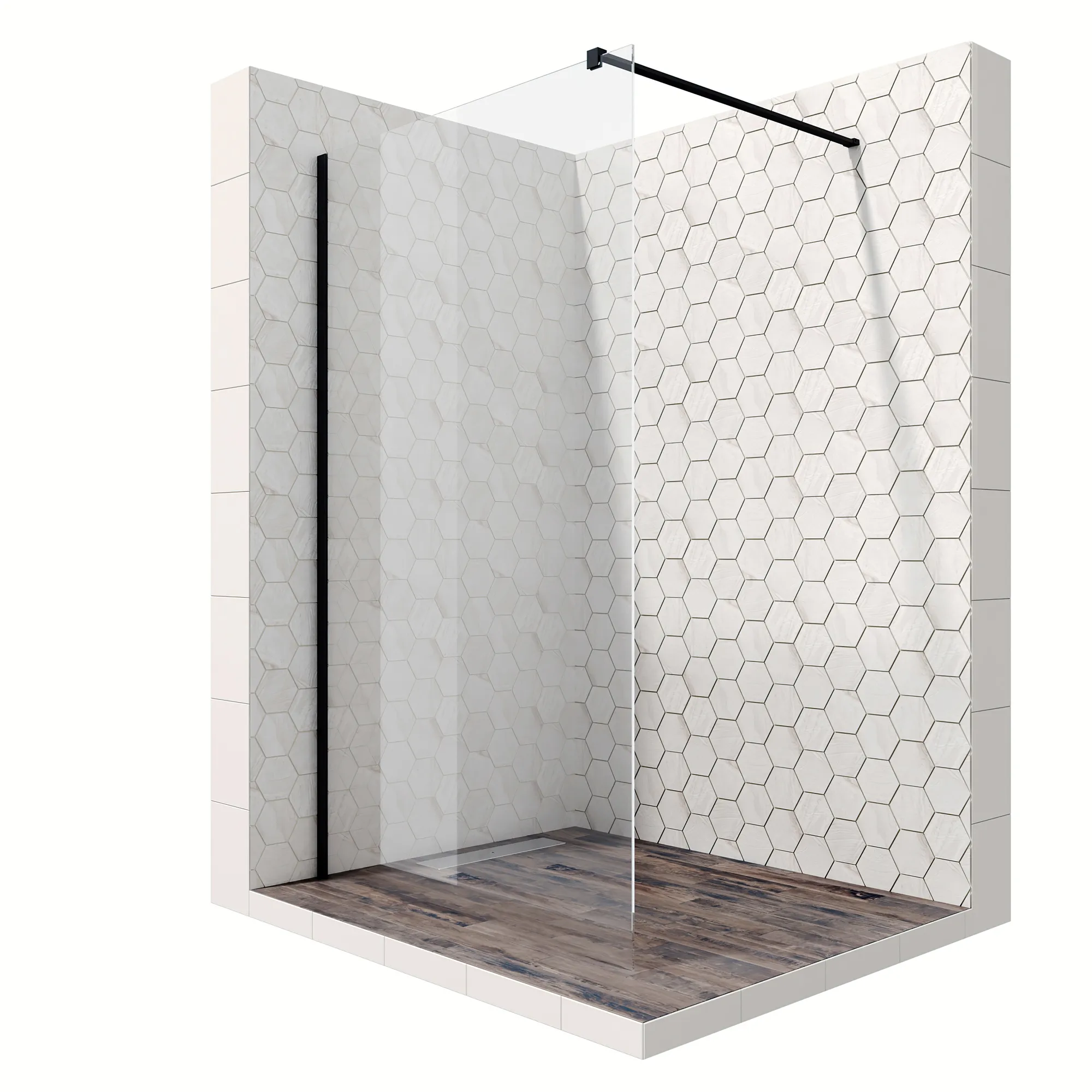 - Душевое ограждение Ambassador Walk-in 15031109, 90*200 (прозрачное закаленное стекло, профиль алюминий/матовый черный, ширина входа - 100 см; для установки на пол со встроенным душевым каналом или трапом; на душевой поддон)